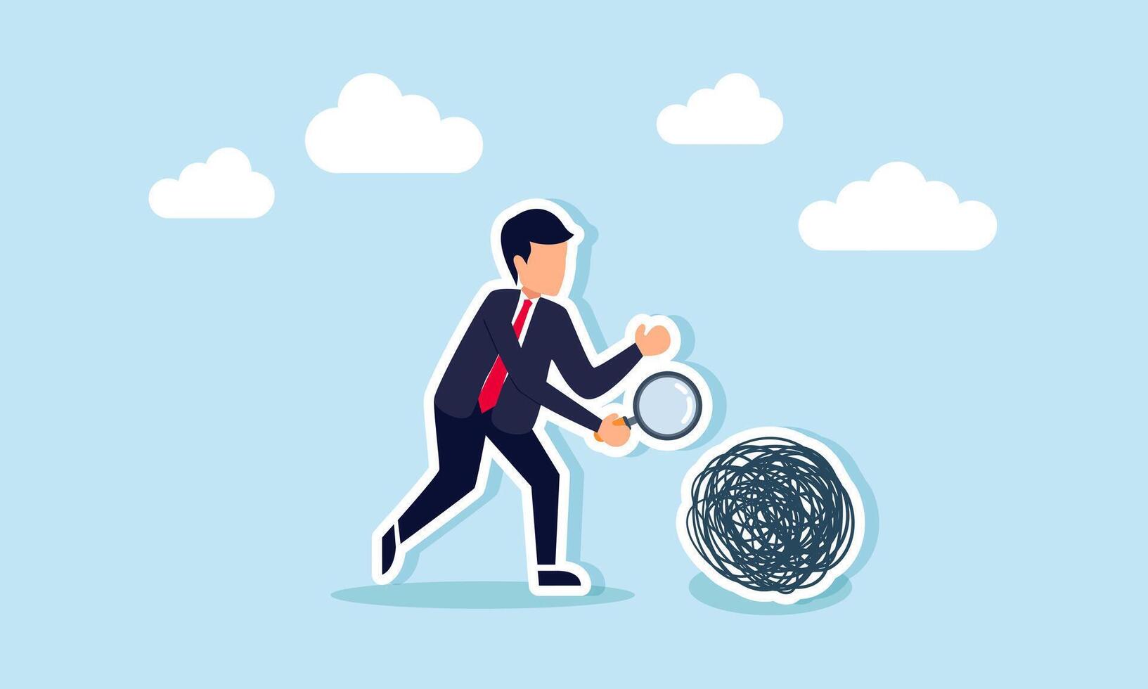 A businessman carries a magnifying glass while examining something complex, illustrating the process of researching and finding solutions to intricate problems Pro Vector