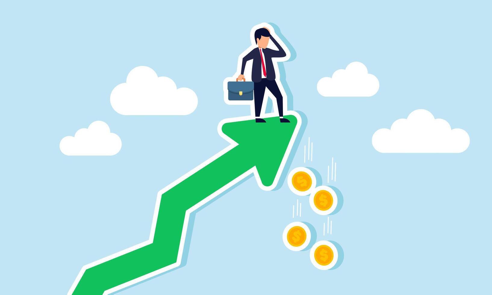 A businessman at the tip of an arrow finds several dollar coins that have fallen, illustrating the effect of valuation decline after reaching an all-time high Pro Vector