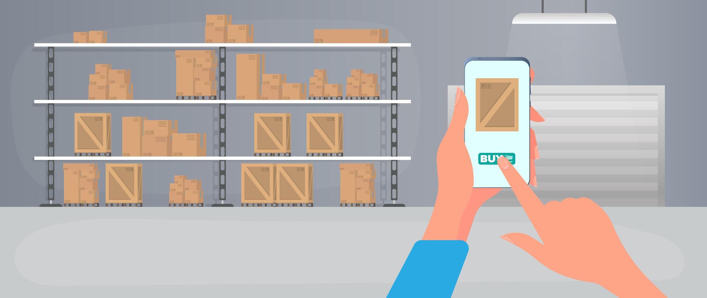 Ordering a package via phone. Online ordering goods from stock. Large warehouse with drawers. Rack with drawers and boxes. Carton boxes. . Pro Vector