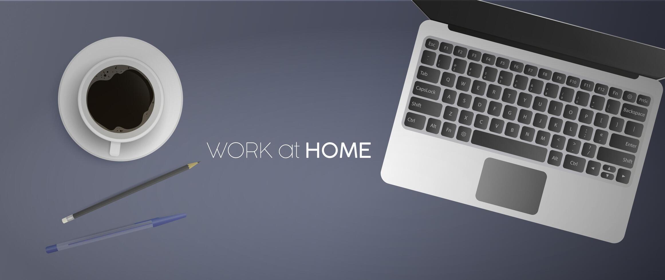 Flat lay of office workplace. Desktop top. Computer monitor, keyboard, computer mouse, cup of coffee, pen, pencil. Realistic illustration. Pro Vector