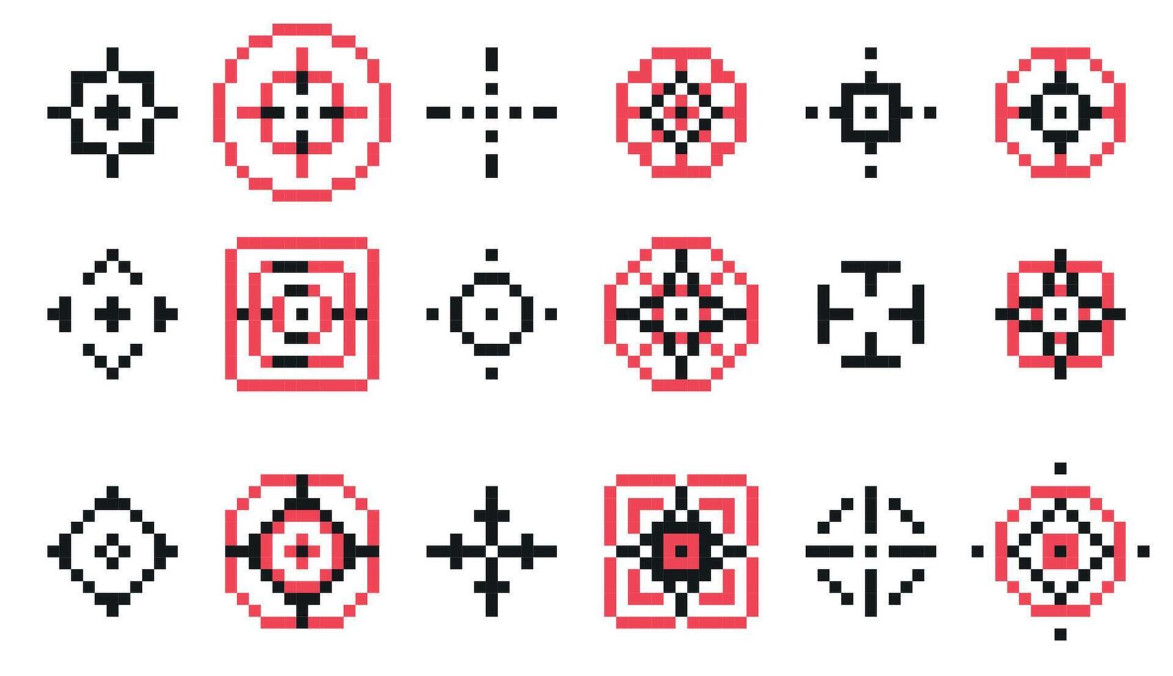 Pixel target icon. Retro game crosshair aim, retro military gun scope, 8 bit bullseye target for hunting and archery. flat focus and accuracy symbol Pro Vector