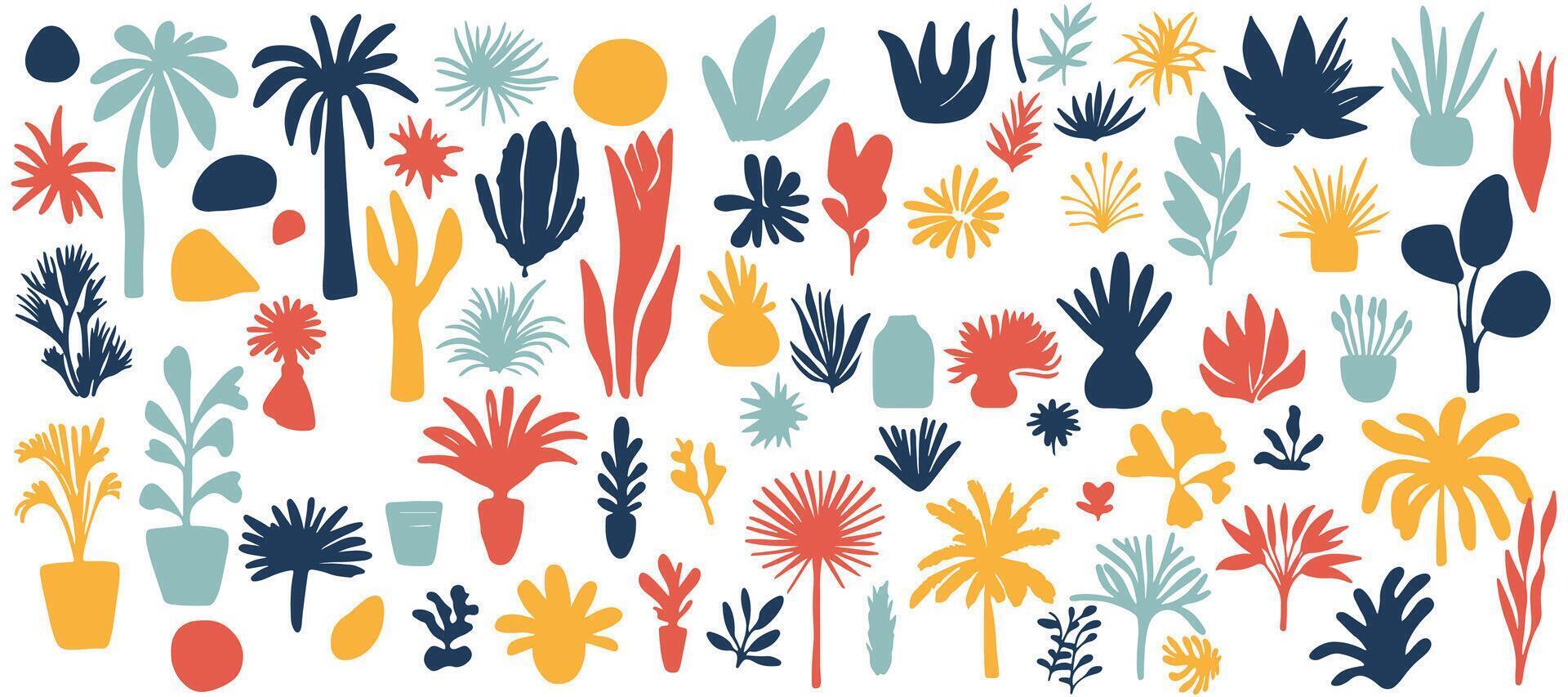 Abstract hand drawn shapes, boho elements, plants, and palm trees in the style of Matisse on a white background Pro Vector