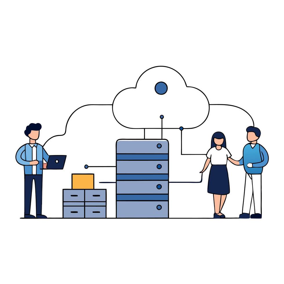 Dark slate blue Flat illustration business technology storage and cloud connect concept with administrator and developer team working Pro Vector