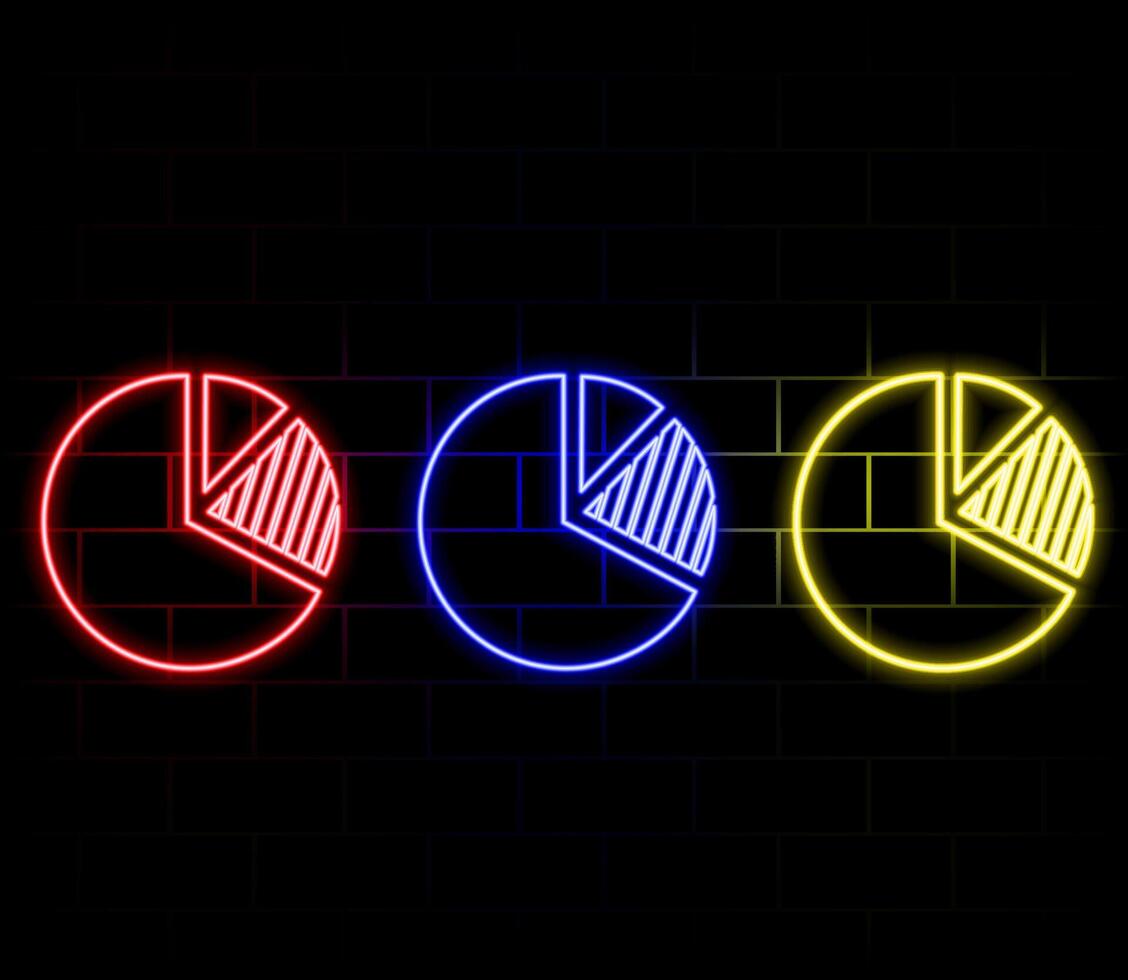 3d rendering wireframe digital techno neon glowing symbol of pie chart with slice with shining dots on black background with blured reflection on floor Pro Vector