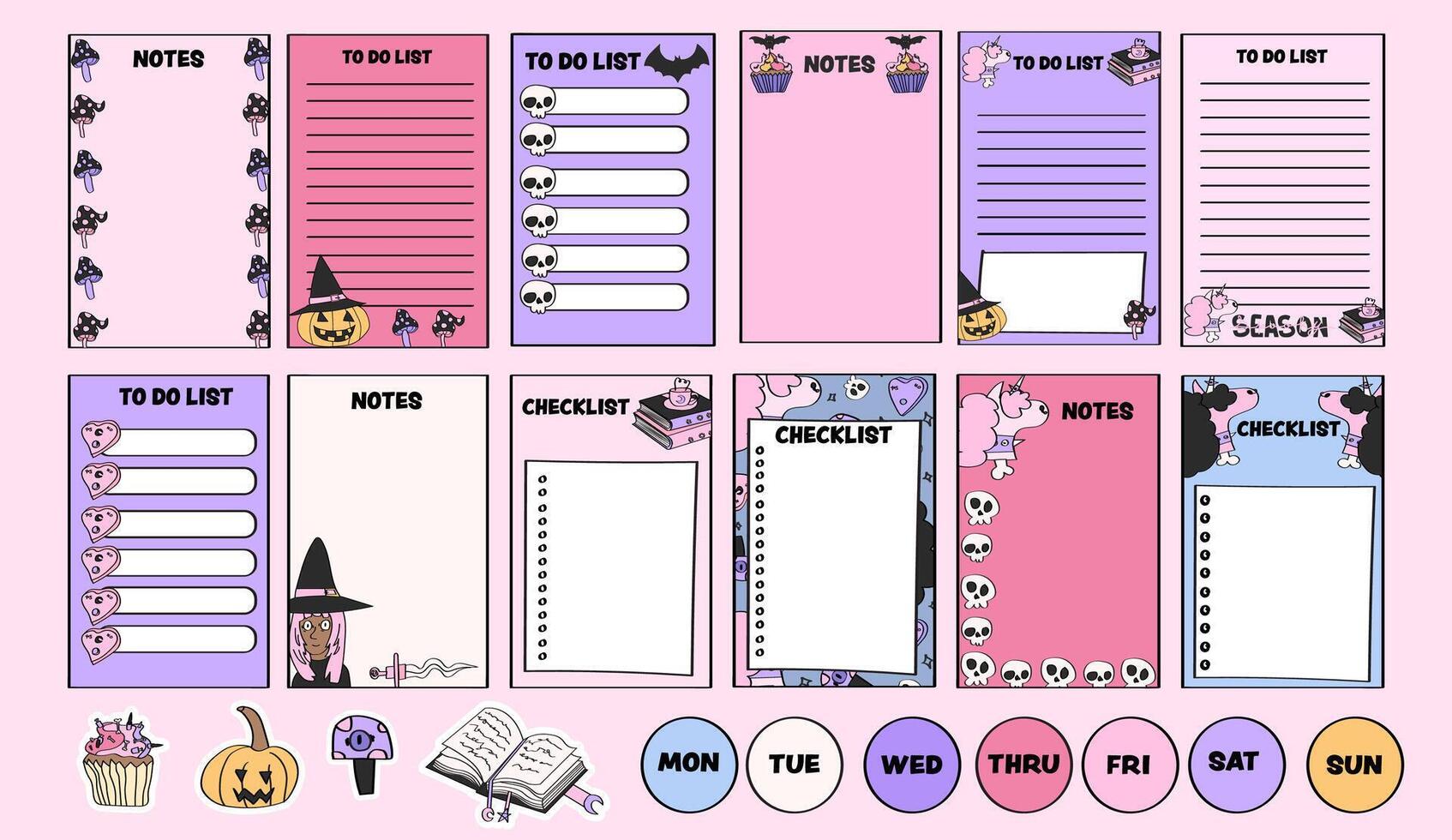 Cute notepad pages for weekly and daily planning with checklists, to do lists, notes and stickers. vector