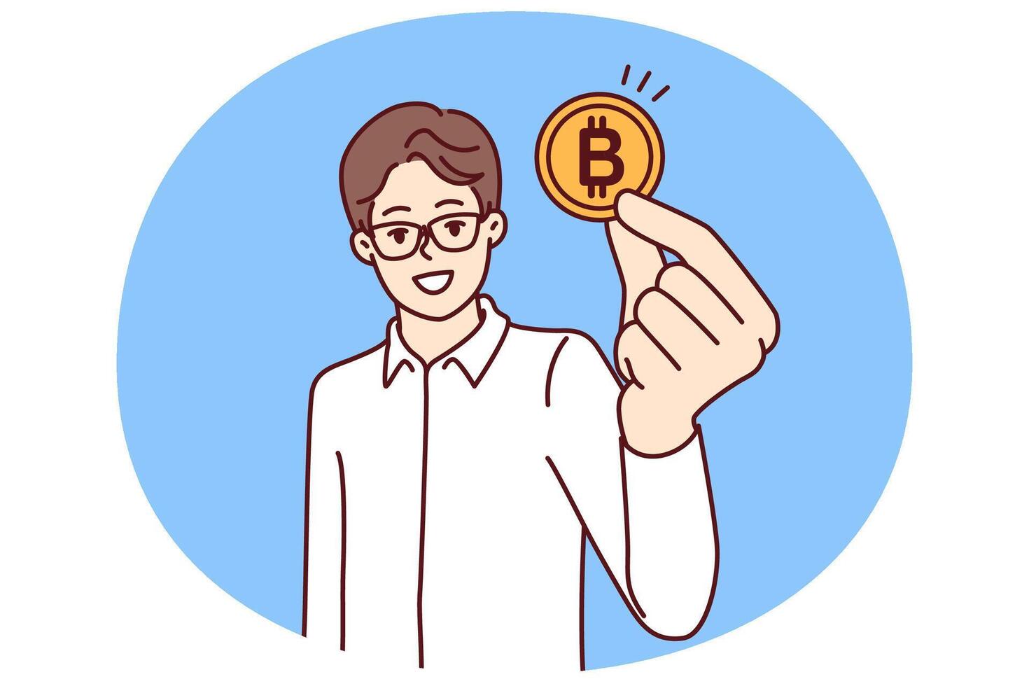 Man trader with bitcoin coin calls for mining or investing in cryptocurrency and blockchain tech Pro Vector