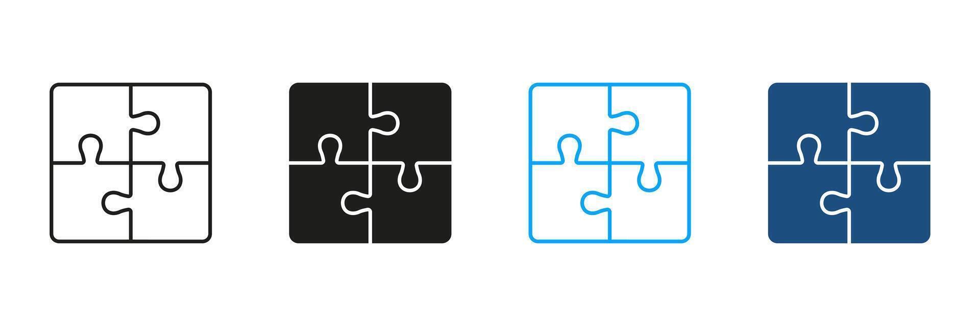Puzzle, Combination Solution Line and Silhouette Icon Set. Jigsaw Square Pieces Match Pictogram. Teamwork, Idea, Challenge Logic Game Sign. Editable Stroke. Isolated Illustration Pro Vector