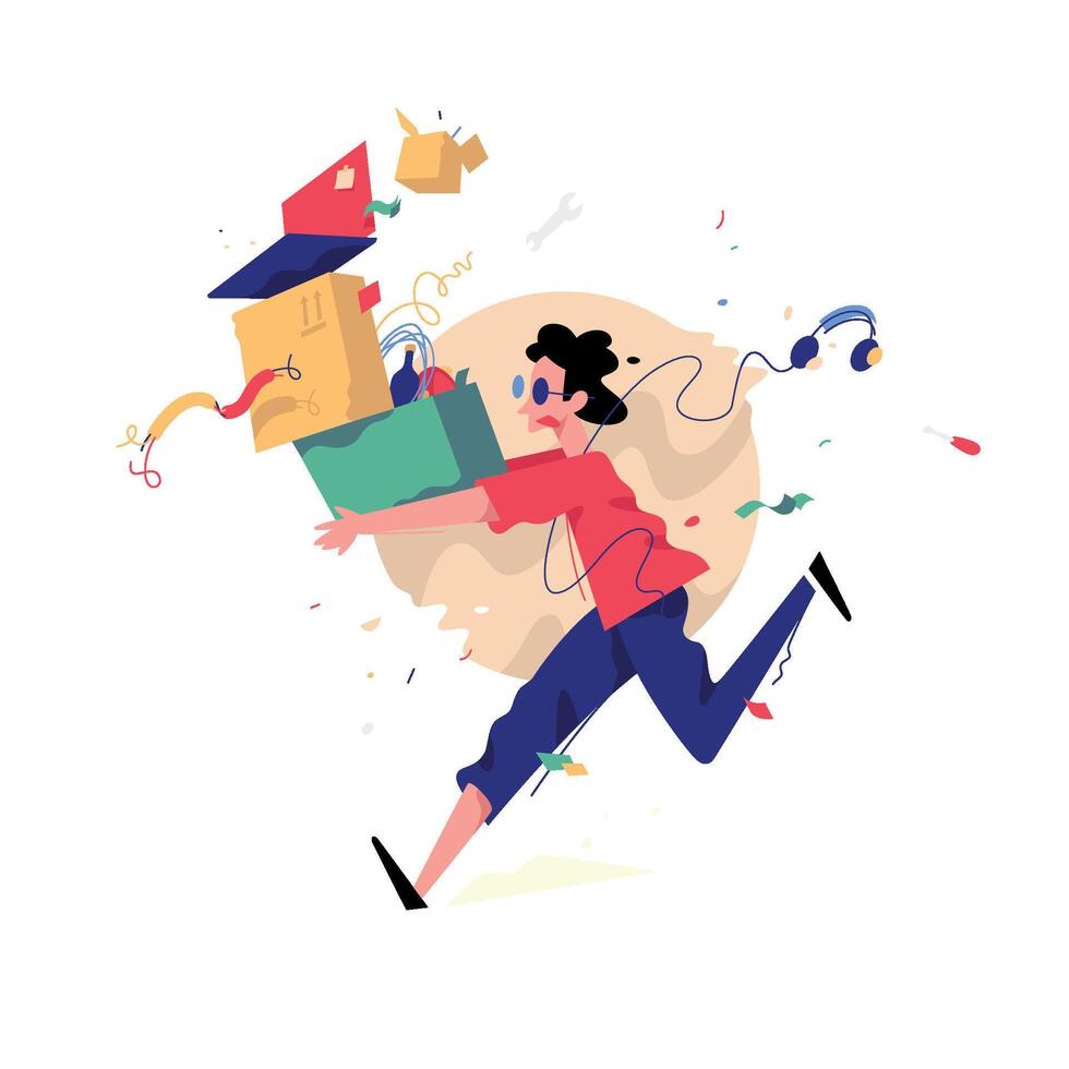Illustration of the system administrator. A running hacker. A cartoon character with things and boxes. Image is isolated on white background. Flat illustration for banner and site. Pro Vector