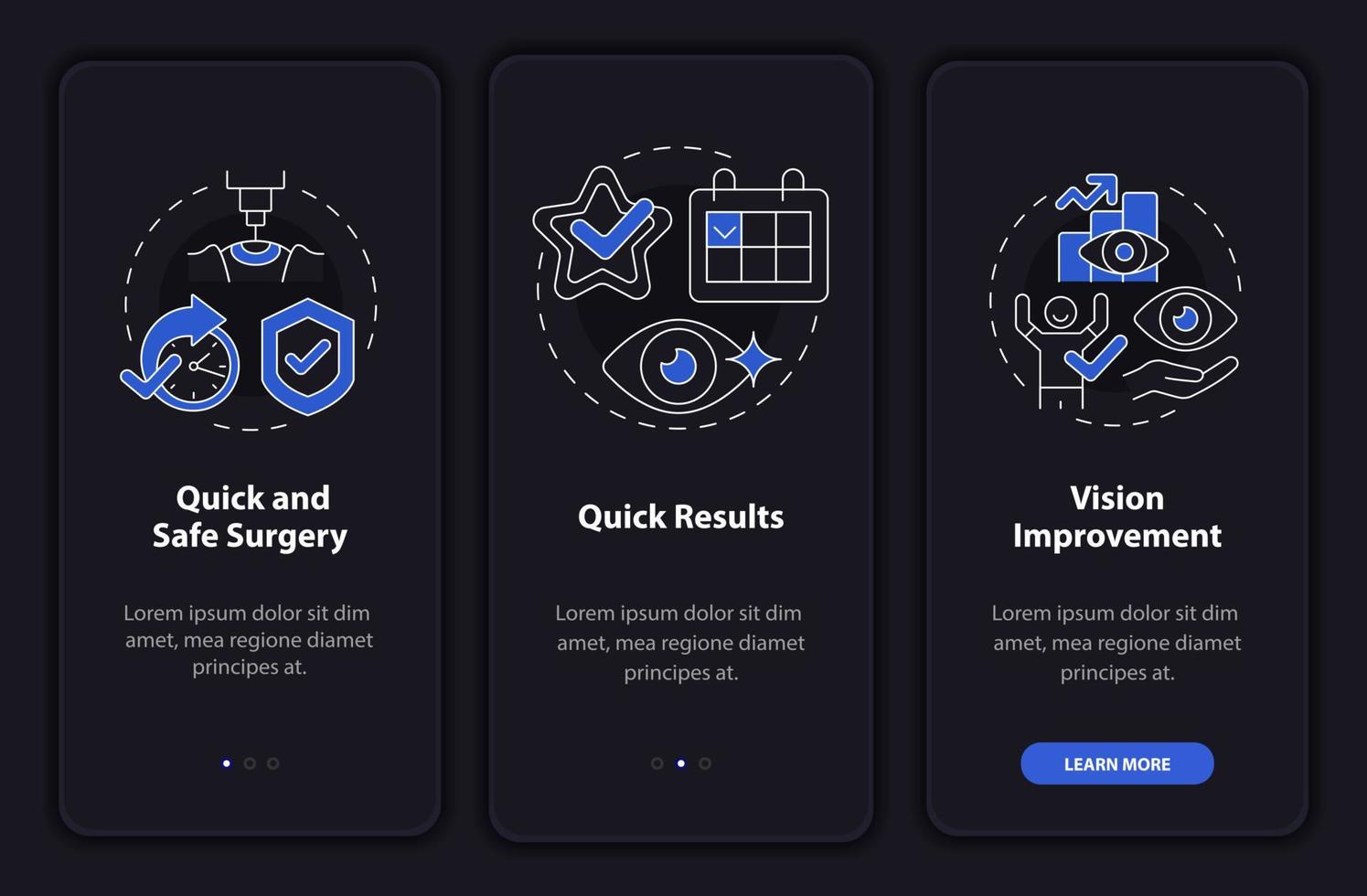 Pros of laser eye surgery black onboarding mobile app page screen. Treatment walkthrough 3 steps graphic instructions with concepts. UI, UX, GUI vector template with linear night mode illustrations Pro Vector