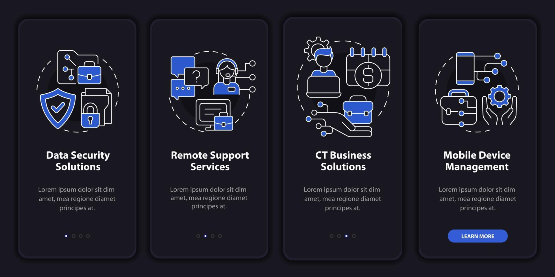 Corporate computer service night mode onboarding mobile app screen. Walkthrough 4 steps graphic instructions pages with linear concepts. UI, UX, GUI template. Myriad Pro-Bold, Regular fonts used Pro Vector
