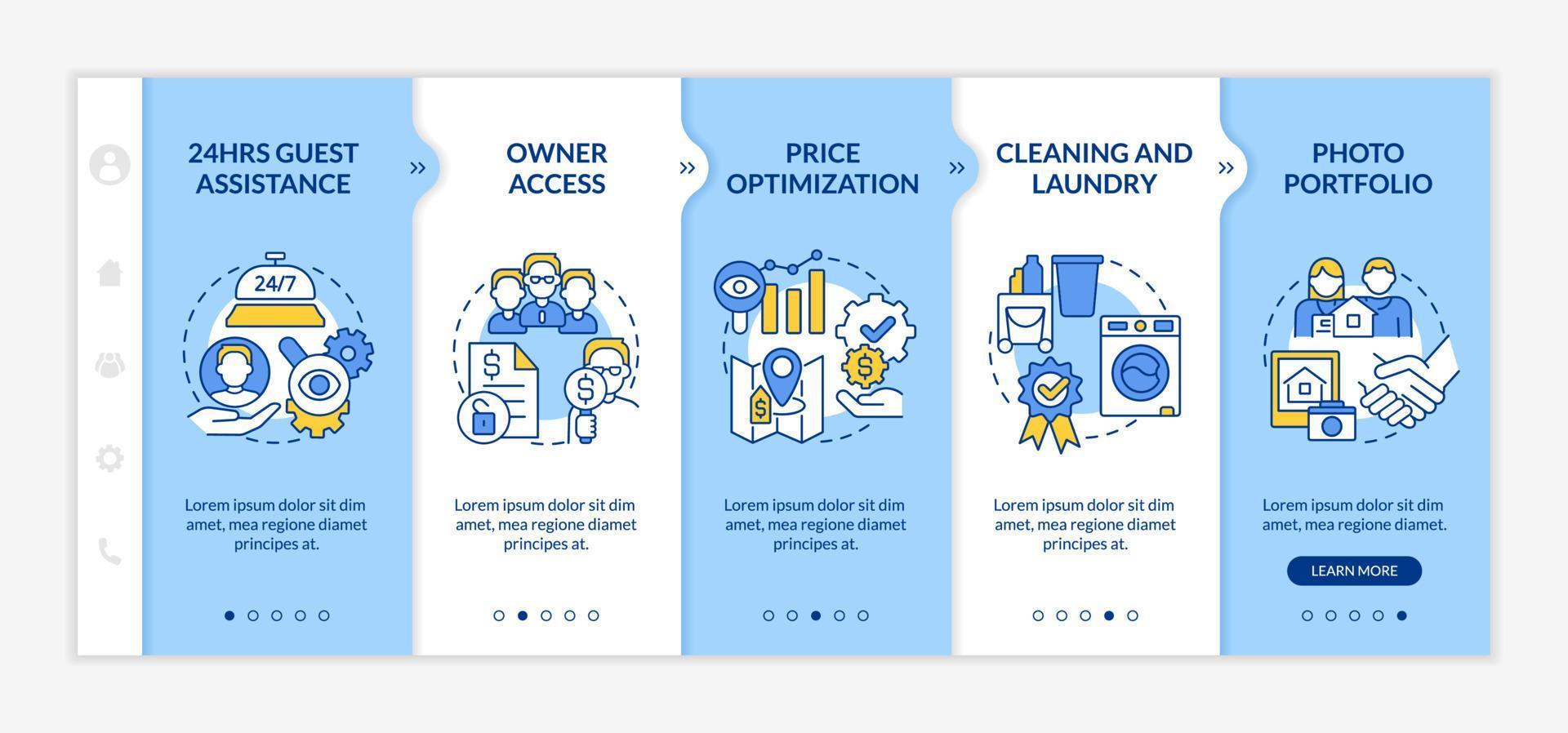 Property management in hotels blue and white onboarding template. Service tool. Responsive mobile website with linear concept icons. Web page walkthrough 5 step screens. Lato-Bold, Regular fonts used Pro Vector