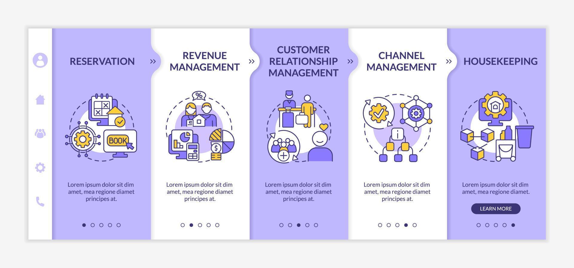 Modules of property management purple and white onboarding template. Responsive mobile website with linear concept icons. Web page walkthrough 5 step screens. Lato-Bold, Regular fonts used Pro Vector