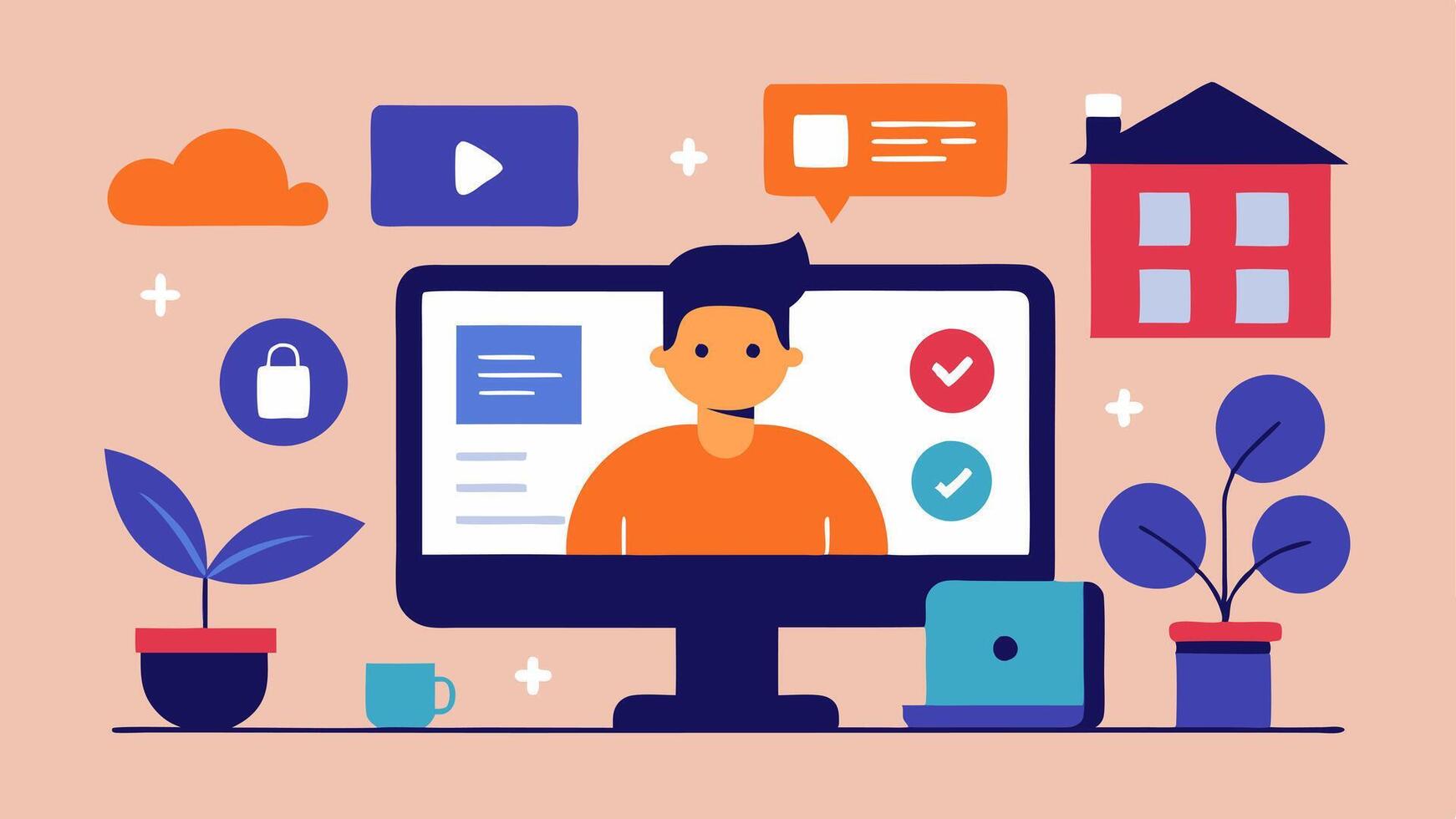 Personalized Workspace A cozy home office with a user configuring their screen layout by merely looking at different areas while icons shift around to accommodate their. Pro Vector