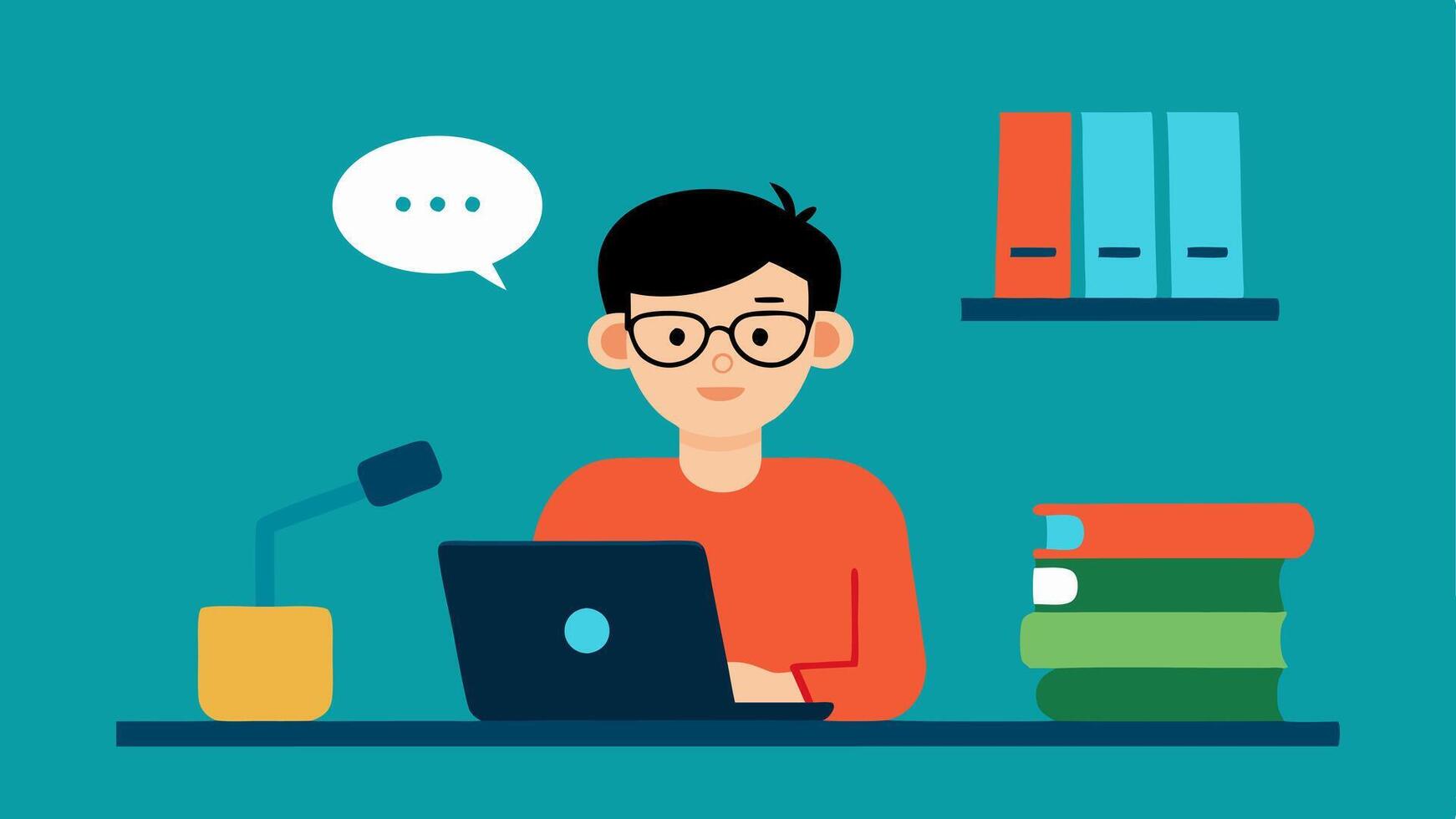 Student in Library A student with glasses using a laptop speaking into a microphone. The text pops up on the screen showing notes being taken for study purposes.. Pro Vector