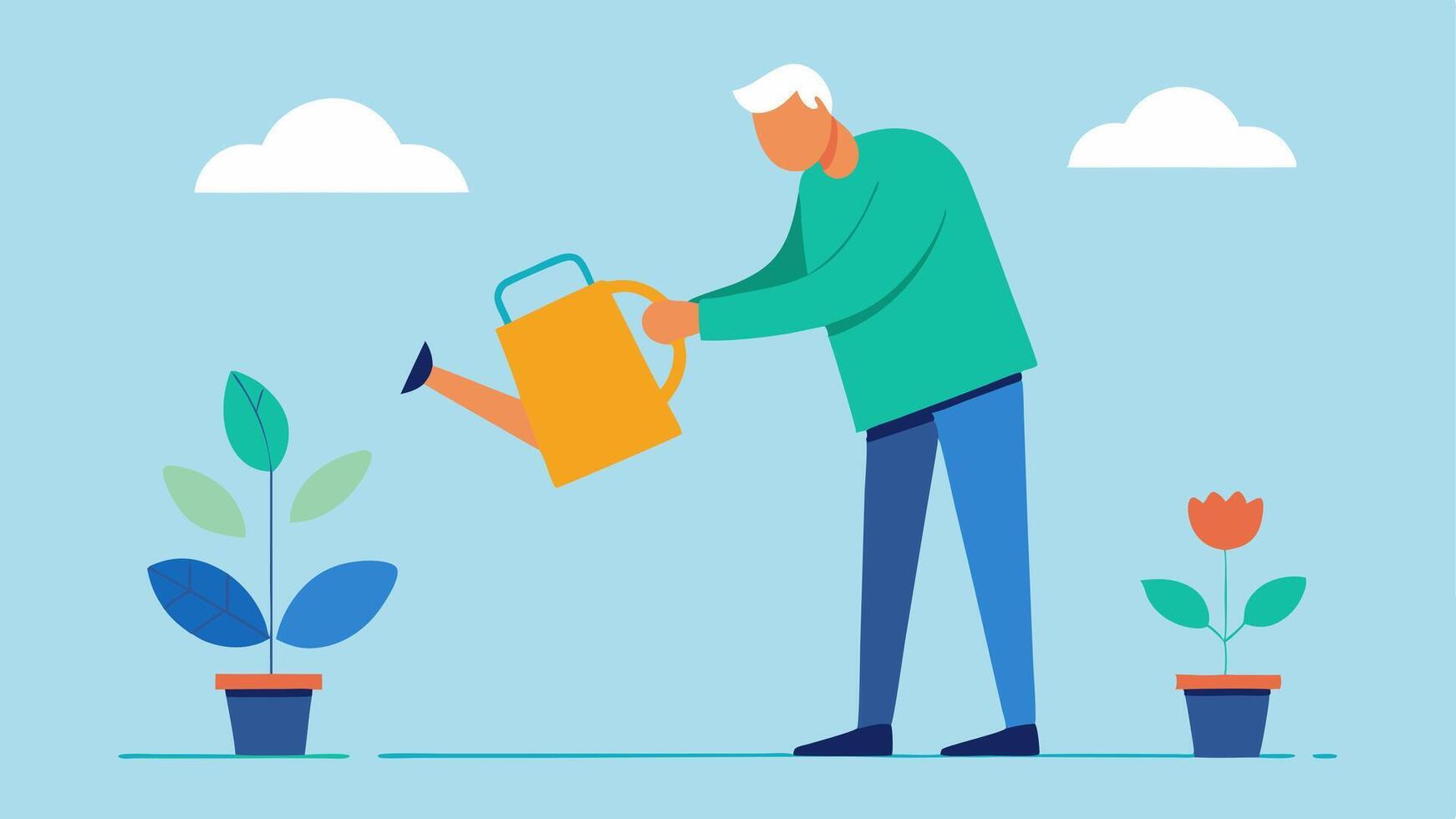 Watering Can with a Long Handle An illustration of a senior easily watering plants with an adaptive watering can that has a long handle for easier reach.. Pro Vector