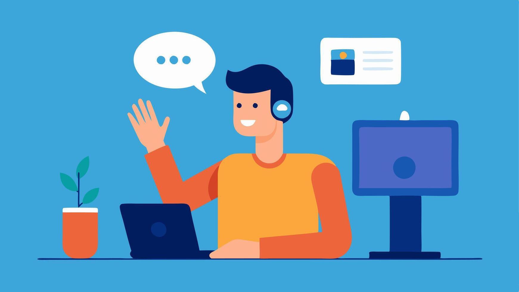 Voice Command Technology A person gesturing toward their smart assistant device on their desk directing it to perform tasks illustrating handsfree workplace assistance.. Pro Vector