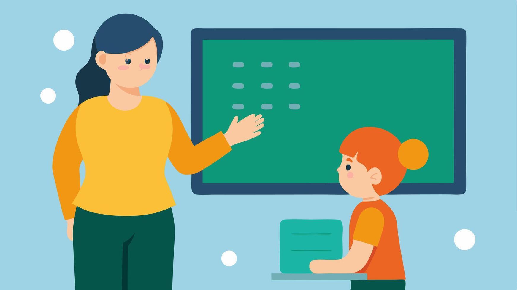 Teacher and Student A teacher guiding a student using a Braille display in a classroom with educational materials and a chalkboard in the background emphasizing learning.. Pro Vector