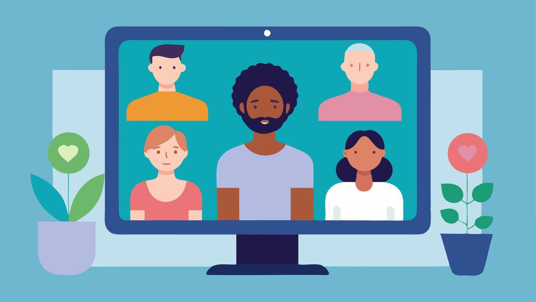 Virtual Wellness Session A showing a computer screen with diverse individuals joining an online wellness session from home with captions and interpreting services included.. Pro Vector