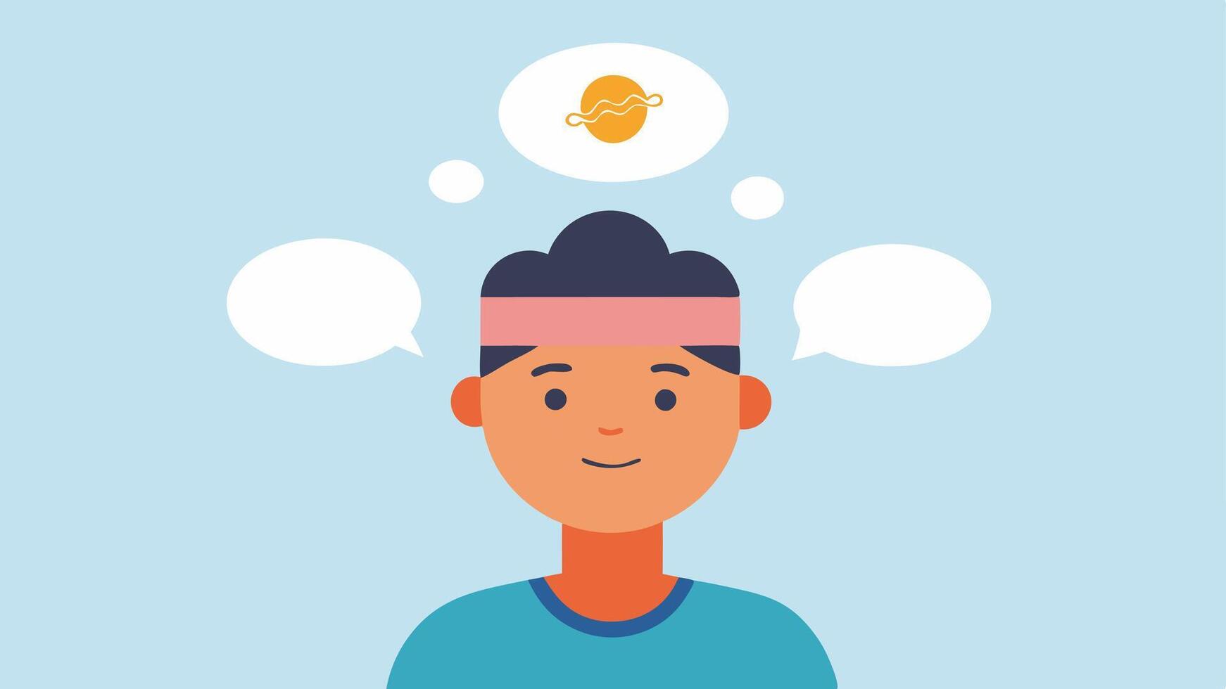 Thought Bubbles A person wearing the headband with thought bubbles above their head containing ideas memories and questions indicating enhanced cognitive processing.. Pro Vector