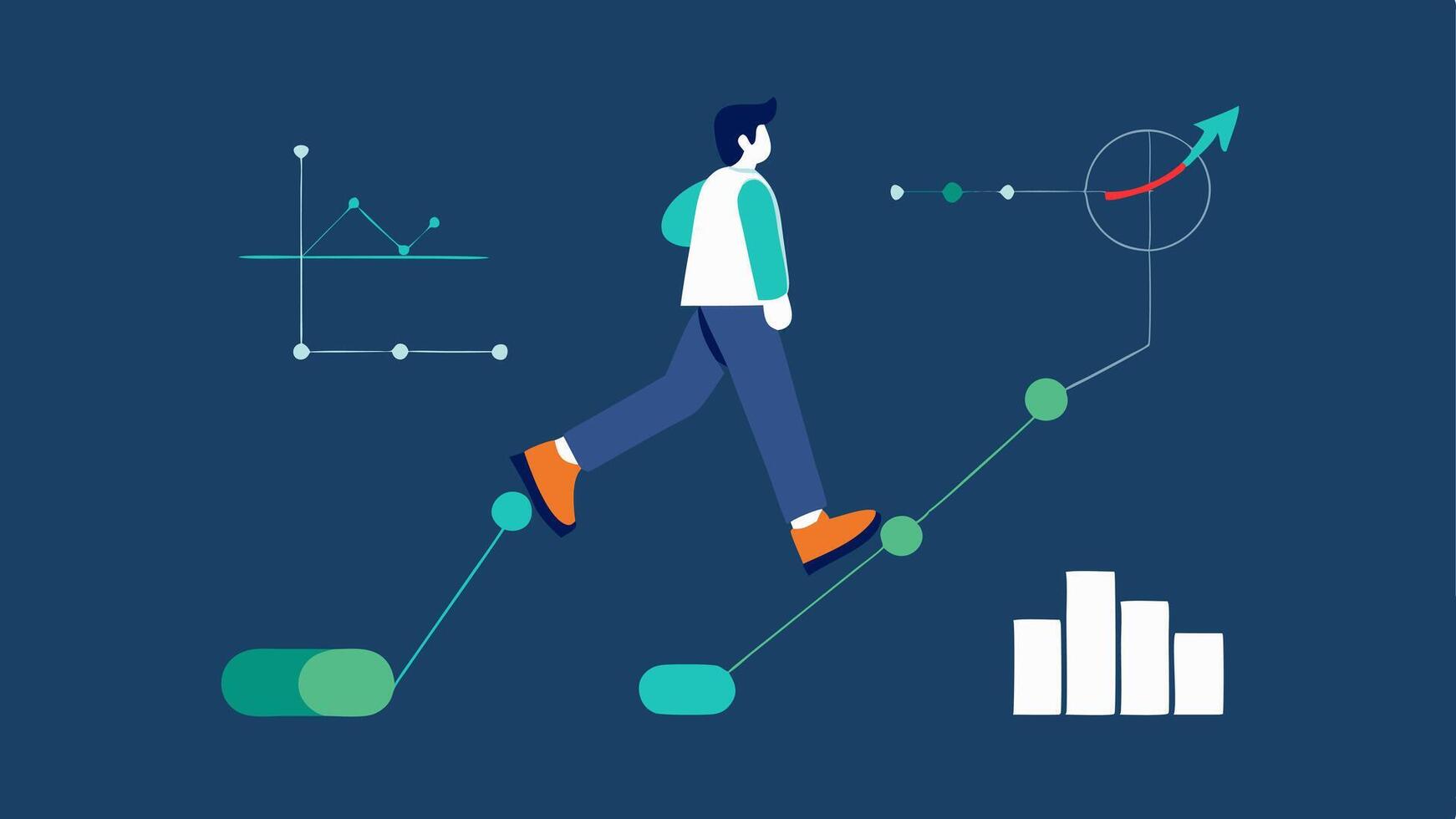 Walking Path An overhead view of a person walking on a path surrounded by graphs and charts displaying data points from a shoes gait analysis.. Pro Vector
