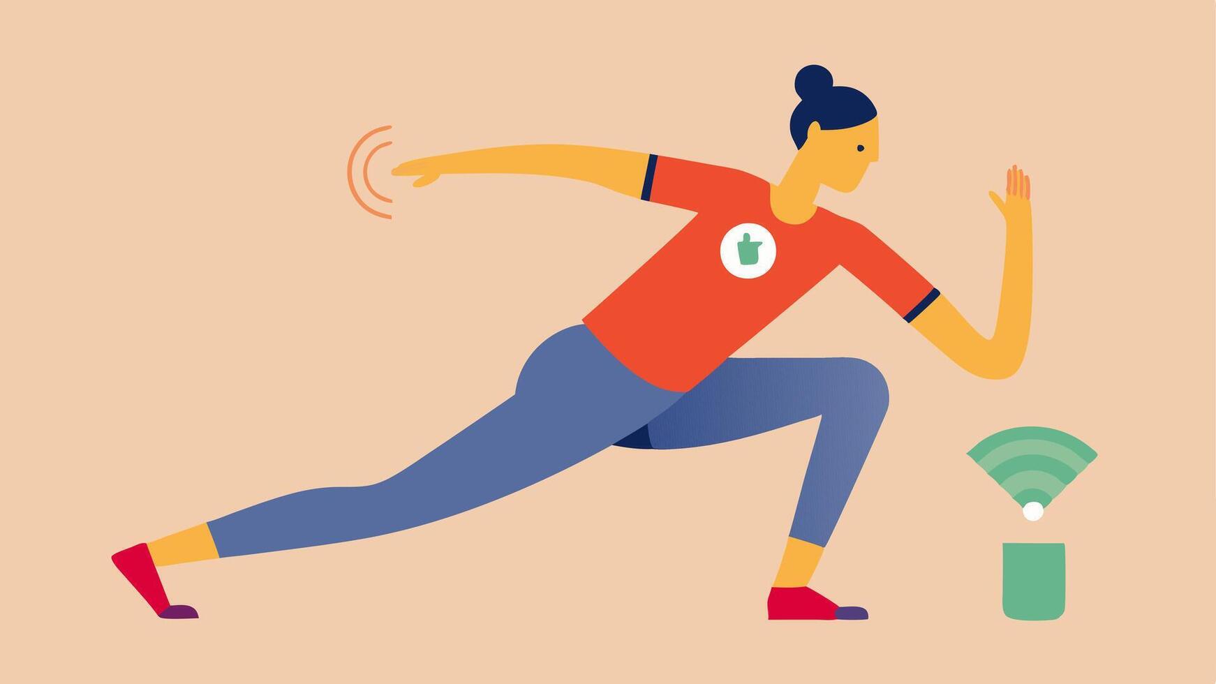 Stretching Guidance A person stretching with sensor feedback represented on a device that provides suggestions for proper stretches based on muscle tension readings.. Pro Vector