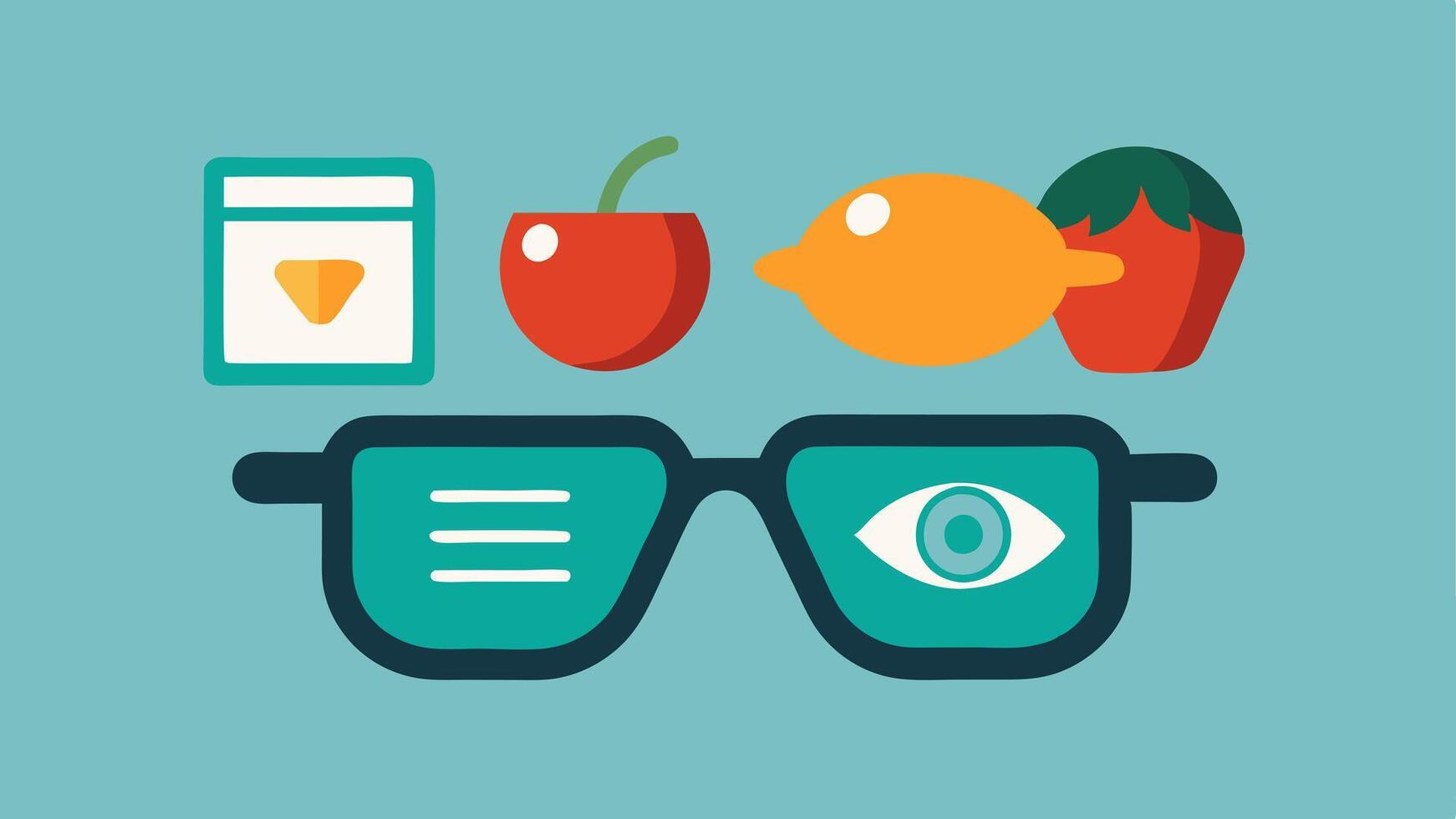 User Scanning Food An illustration of the glasses with a small camera icon scanning food items analyzing their nutritional information and displaying it to the user.. Pro Vector