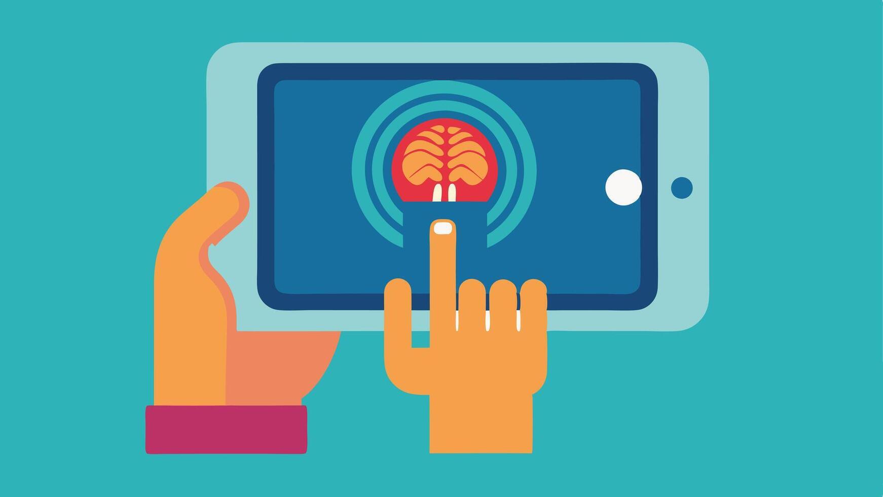 User Interaction An illustration of a hand interacting with a tablet tapping on specific body parts in the MRI image to get detailed information and symptoms.. Pro Vector