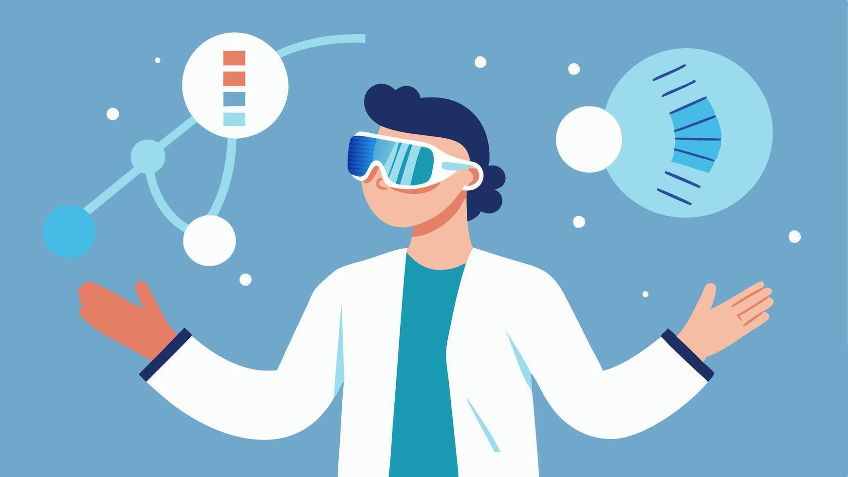 Virtual Experimentation A scientist using augmented reality glasses to manipulate gene sequences with virtual tools floating in the air around them.. Pro Vector