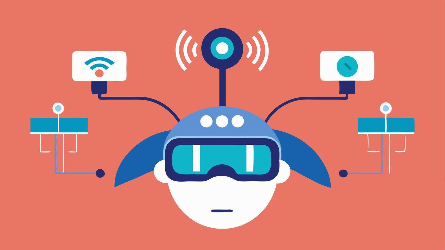 Wearable Tech A detailed view of the biohackers wearable neurotech device displaying sensors and screens showing realtime brainwave activity while the drone flies in sync.. Pro Vector