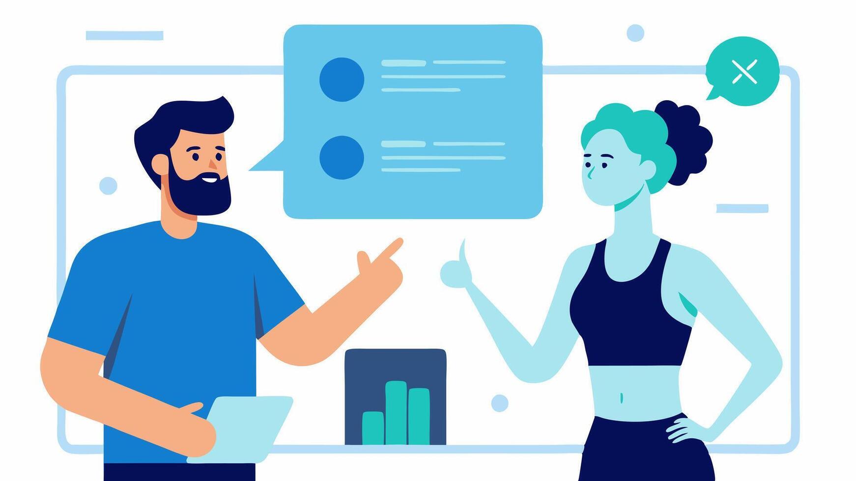 Trainer and Client with Data Screen A personal trainer pointing at a digital screen displaying genetic information while discussing fitness strategies with a client.. Pro Vector