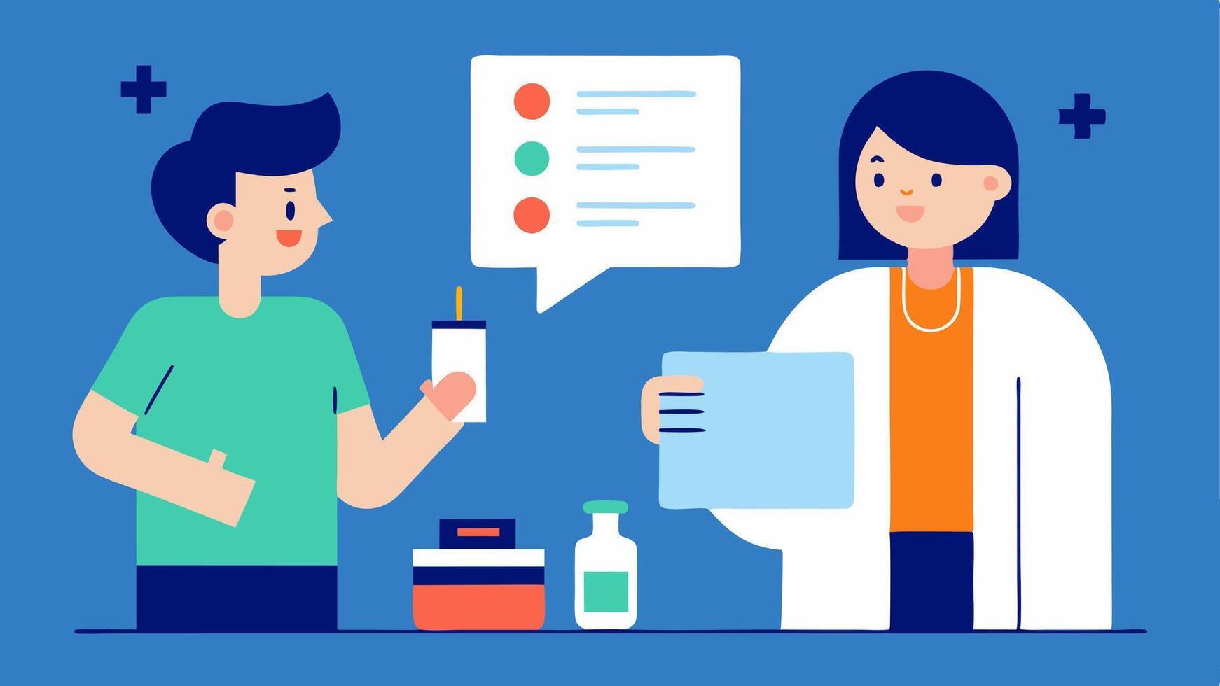 Vaccination Guidance The doctor discussing vaccination options with the patient showing a chart of vaccines while the patient appears inquisitive and engaged.. Pro Vector