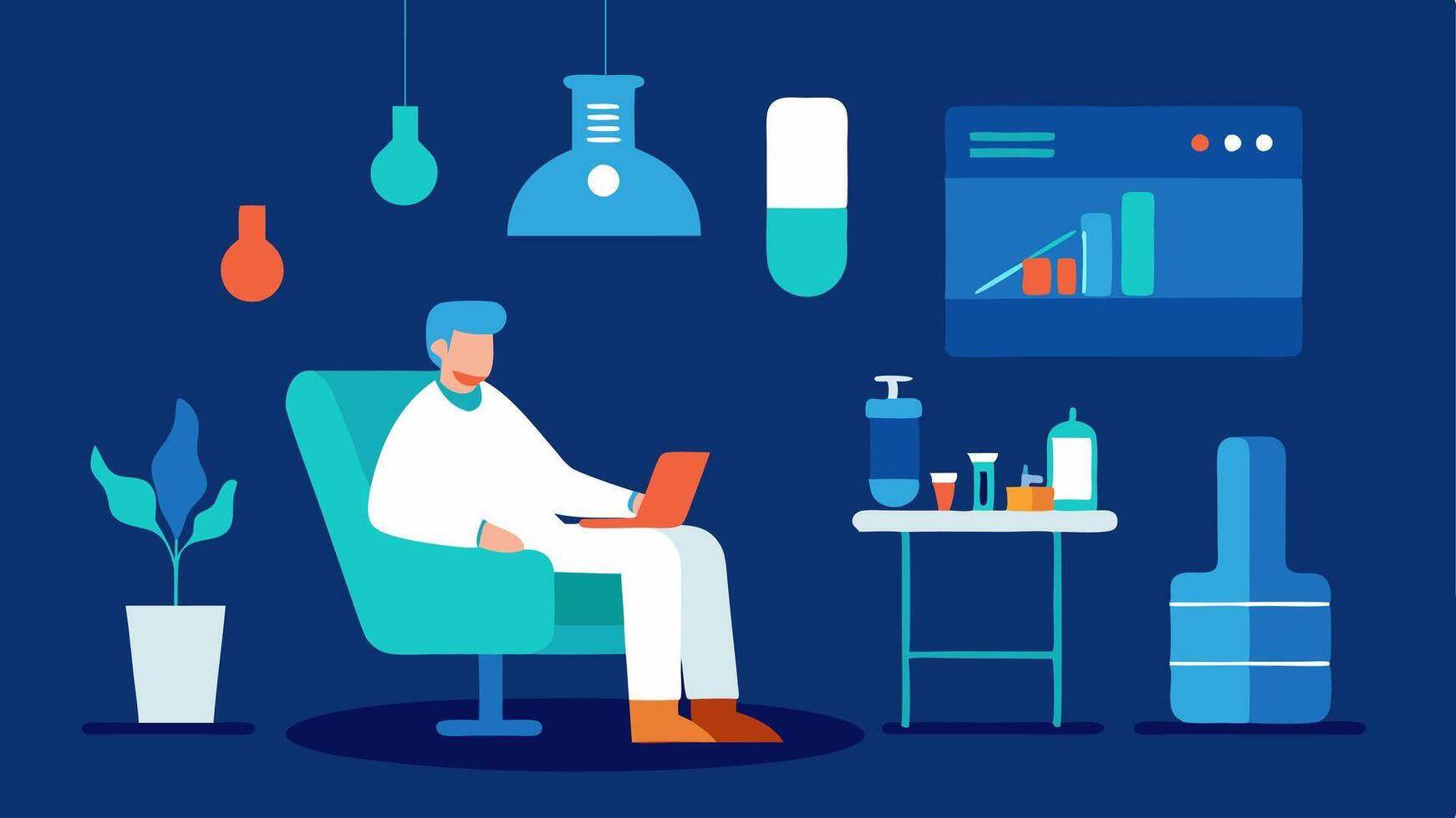 Stress Relief Research A calm space within the lab with a comfortable chair and soothing light where researchers are experimenting with relaxation techniques or devices.. Pro Vector