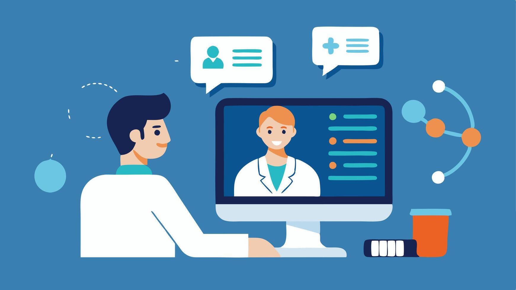 Virtual Genetic Consultation A doctor conducting a virtual consultation with a patient via computer with DNA strands and health statistics floating around.. Pro Vector