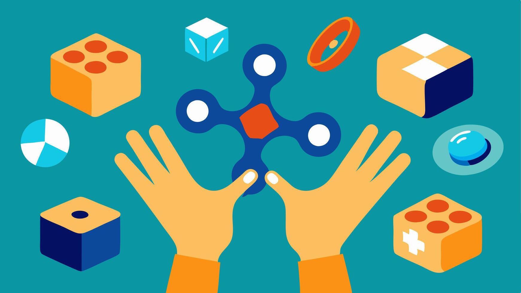 Fidgeting Hands A closeup of hands playing with various fidget items like spinners cubes and bands to show active sensory engagement.. Pro Vector