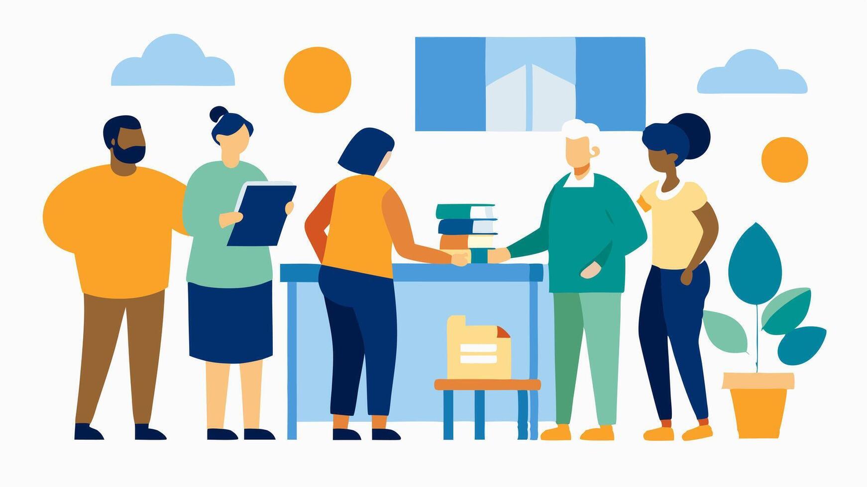 Community Center An image of a community center with adults gathered around a resource table picking up information about courses and services available.. Pro Vector