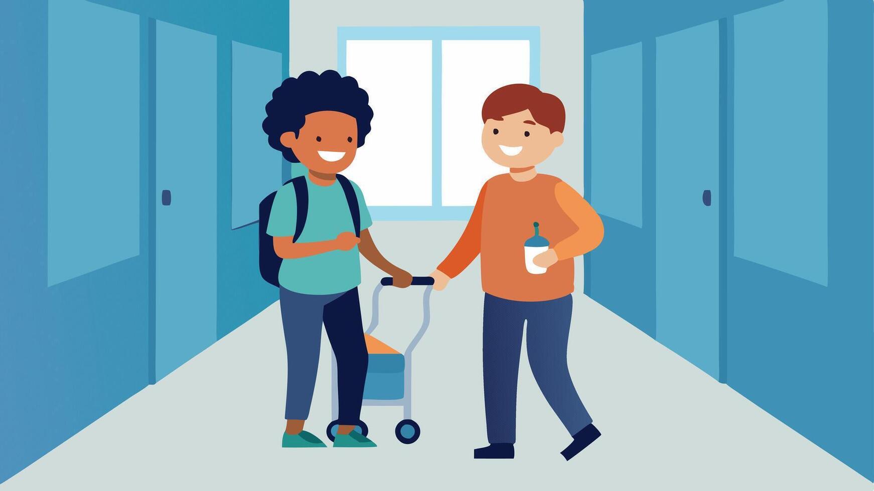 Buddy System Two students walking down a school hallway one student with a mobility device and the other offering an arm for support both laughing and chatting as they share a. Pro Vector