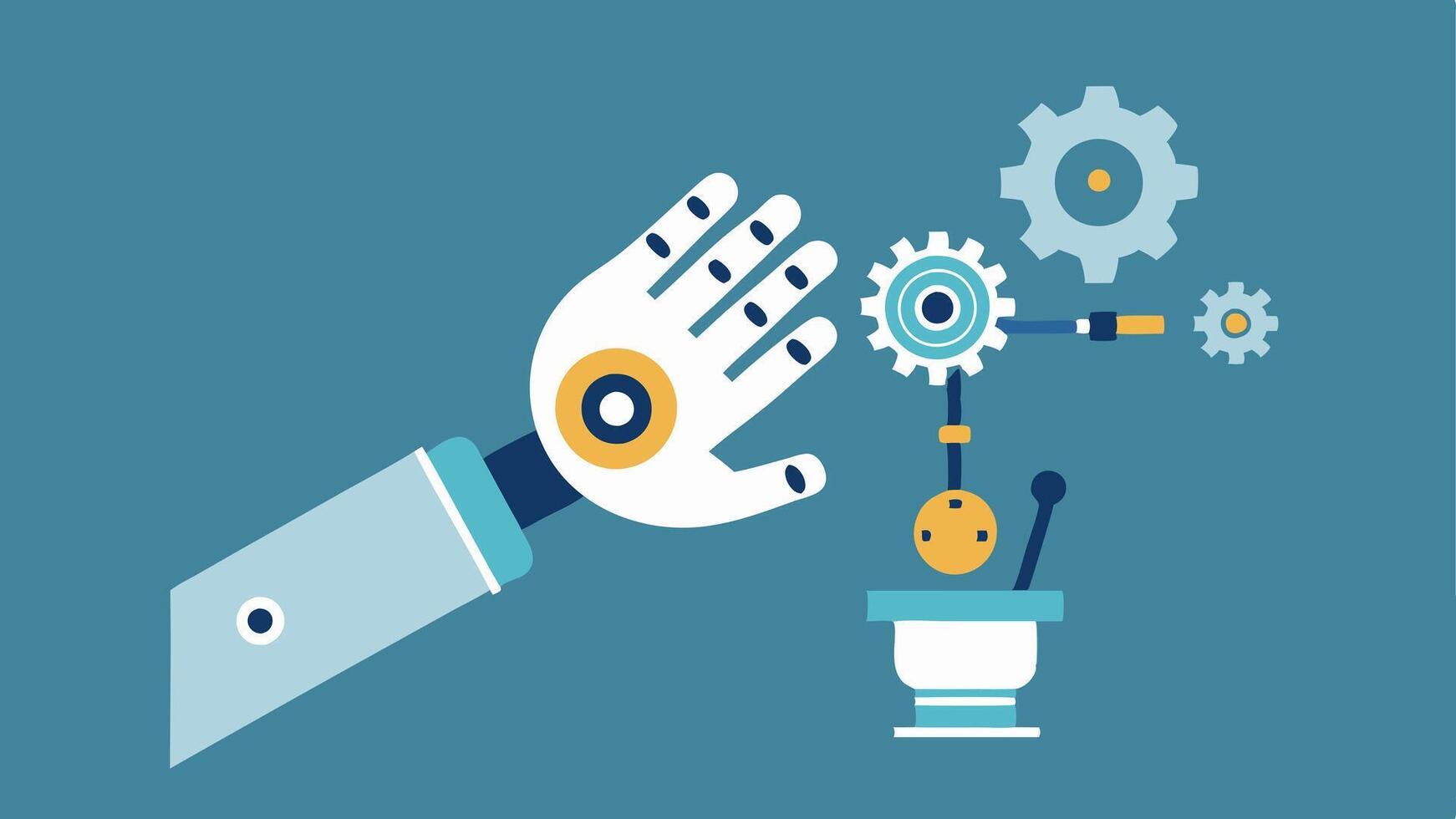 Complex Assembly A bionic hand assembling small mechanical parts demonstrating its precision in aligning gears under a focused light.. Pro Vector