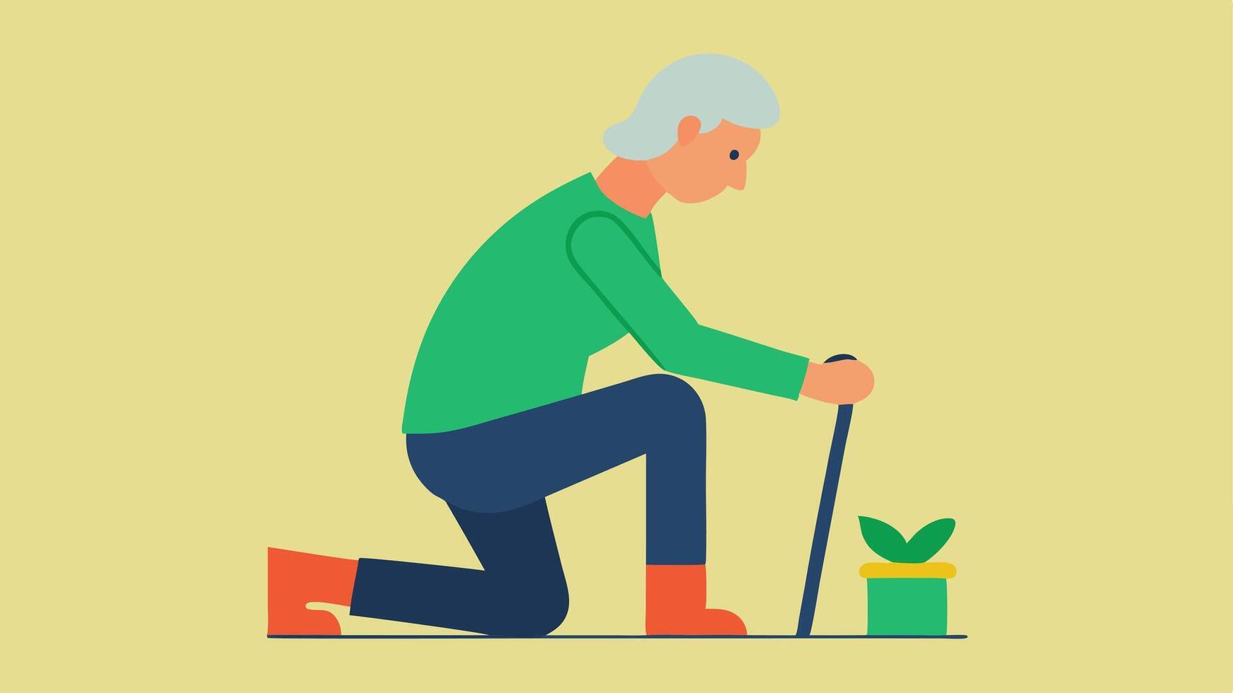 Adaptive Kneeler An image of a senior utilizing a soft kneeler with handles for support while tending to plants reducing strain on the knees and back.. Pro Vector
