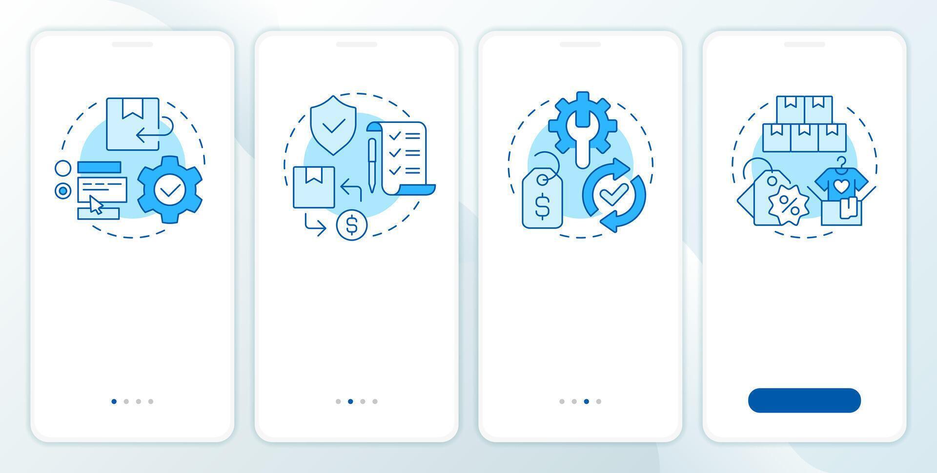 Reverse logistics processes blue onboarding mobile app screen. Walkthrough 4 steps editable graphic instructions with linear concepts. UI, UX, GUI template Pro Vector