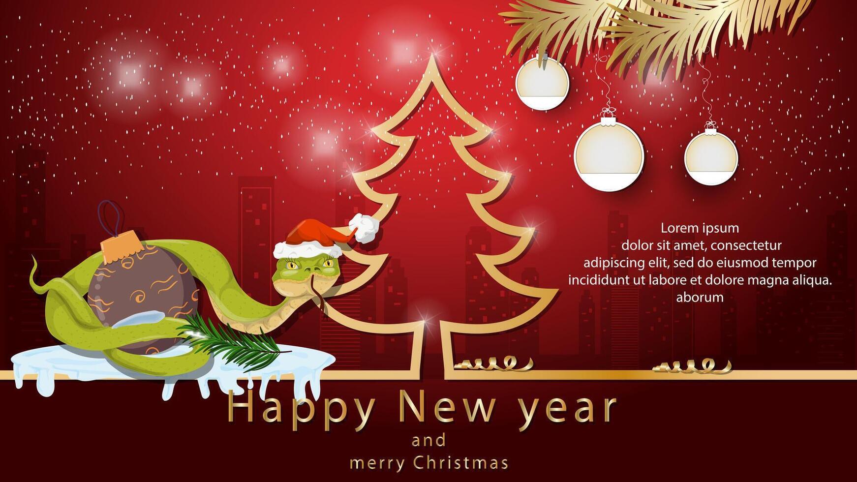 Illustration of the New Year and Christmas A snake wraps around a Christmas tree toy next to a fir tree in the form of a contour Pro Vector