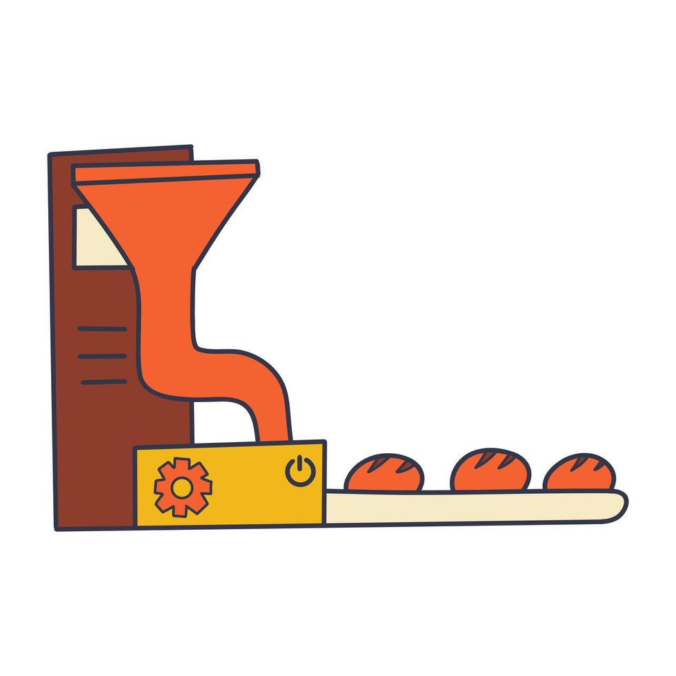 Stylized illustration of a factory machine with a large funnel and conveyor belt processing round objects, representing industrial manufacturing and production. Pro Vector