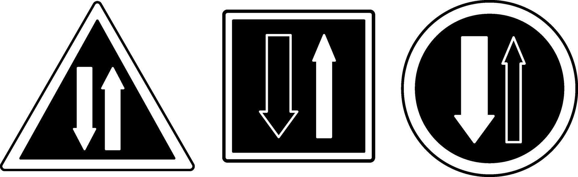 Black Two-Way Traffic Road Signs. Two-Way Traffic Ahead. Give Way to Oncoming Traffic. Priority Over Oncoming Vehicle Free Vector