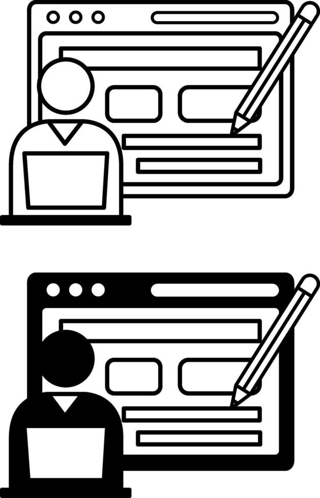 Blogger icons. Black and White Icons. Website with Content and Vlogger with Laptop. Blogging on the Internet. Publishing Content on the Online Platform Pro Vector