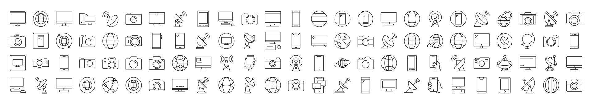 Collection of Line Icons of Photo Camera, Globe, Computer, Radio Locator, Phone. Editable Stroke. Minimalistic Linear Pictogram for Design of Cards, Apps, Banners, Posts Pro Vector