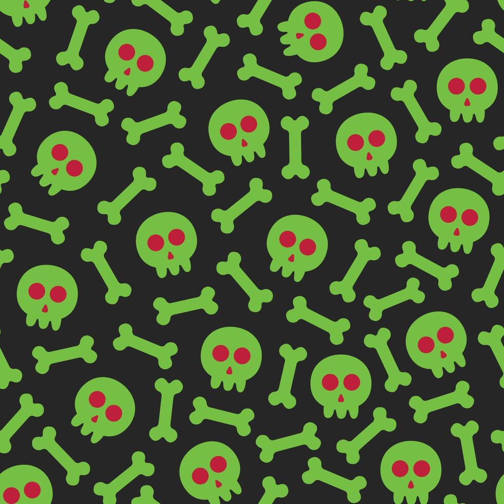 seamless pattern of red-eyed skulls and skeleton bones in green flat design style on red background, horror halloween pattern Pro Vector