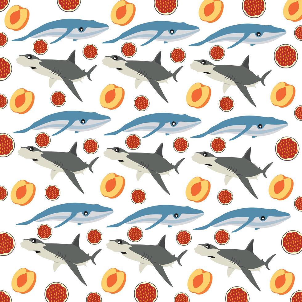 hammerhead shark, whale with fruit as a pattern background Pro Vector