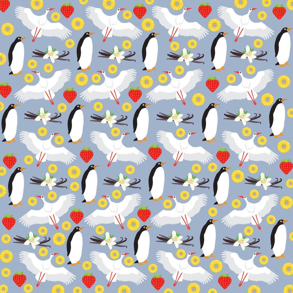 penguin, stork with vanilla and fruit as a pattern background Pro Vector