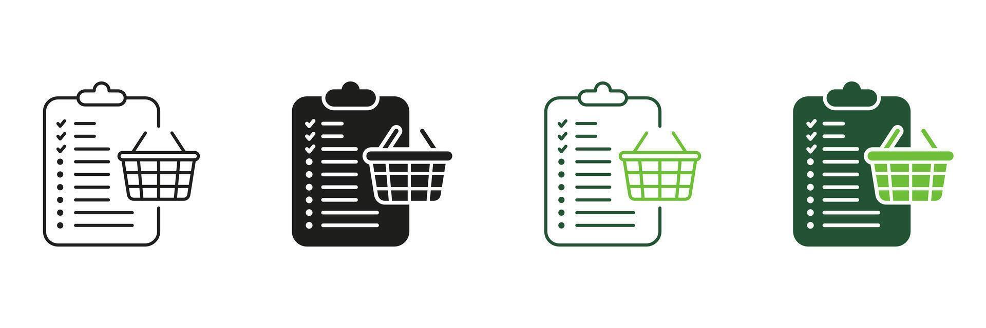 Purchase Checklist Line and Silhouette Icon Set. Grocery List to Buy Pictogram. Order List with Basket Symbol. Procurement Checkout Sign. Editable Stroke. Isolated Illustration Pro Vector