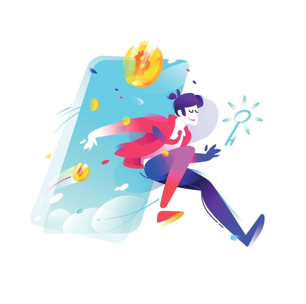 Illustration of a man with coins bitcoin and a dollar. Running trader for layout design. Image is isolated on white background. Flat illustration for banner, presentation and site. Pro Vector