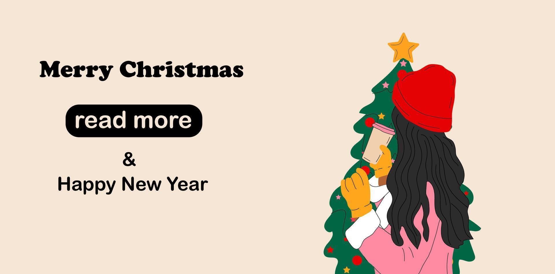 Web page design template. A girl in a hat with a backpack stands in front of a Christmas tree with a cup of coffee. Pro Vector
